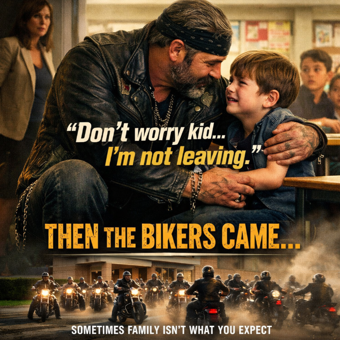 The biker stood up slowly, placing a protective hand on the boy’s shoulder. His eyes moved across the room, meeting the frightened gazes of children and adults alike.